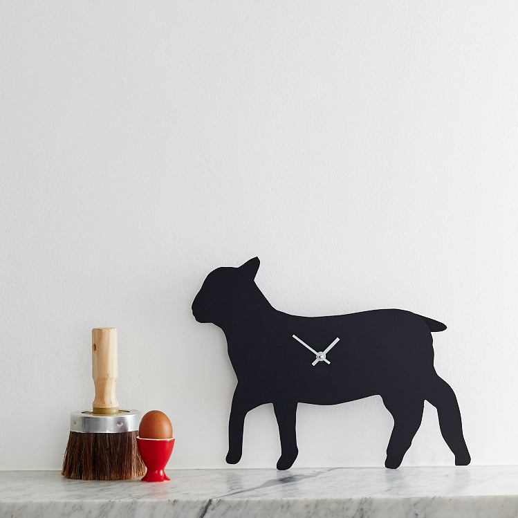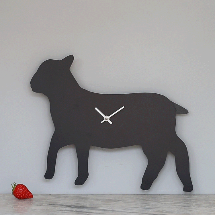 Eine Lammuhr mit wedelndem Schwanz. Sie besteht aus Foamalux mit Nickelzeigern. Wird komplett mit Batterie geliefert. 41 cm x 29 cm. Kann an einem Nagel befestigt oder an die Wand gelehnt werden.