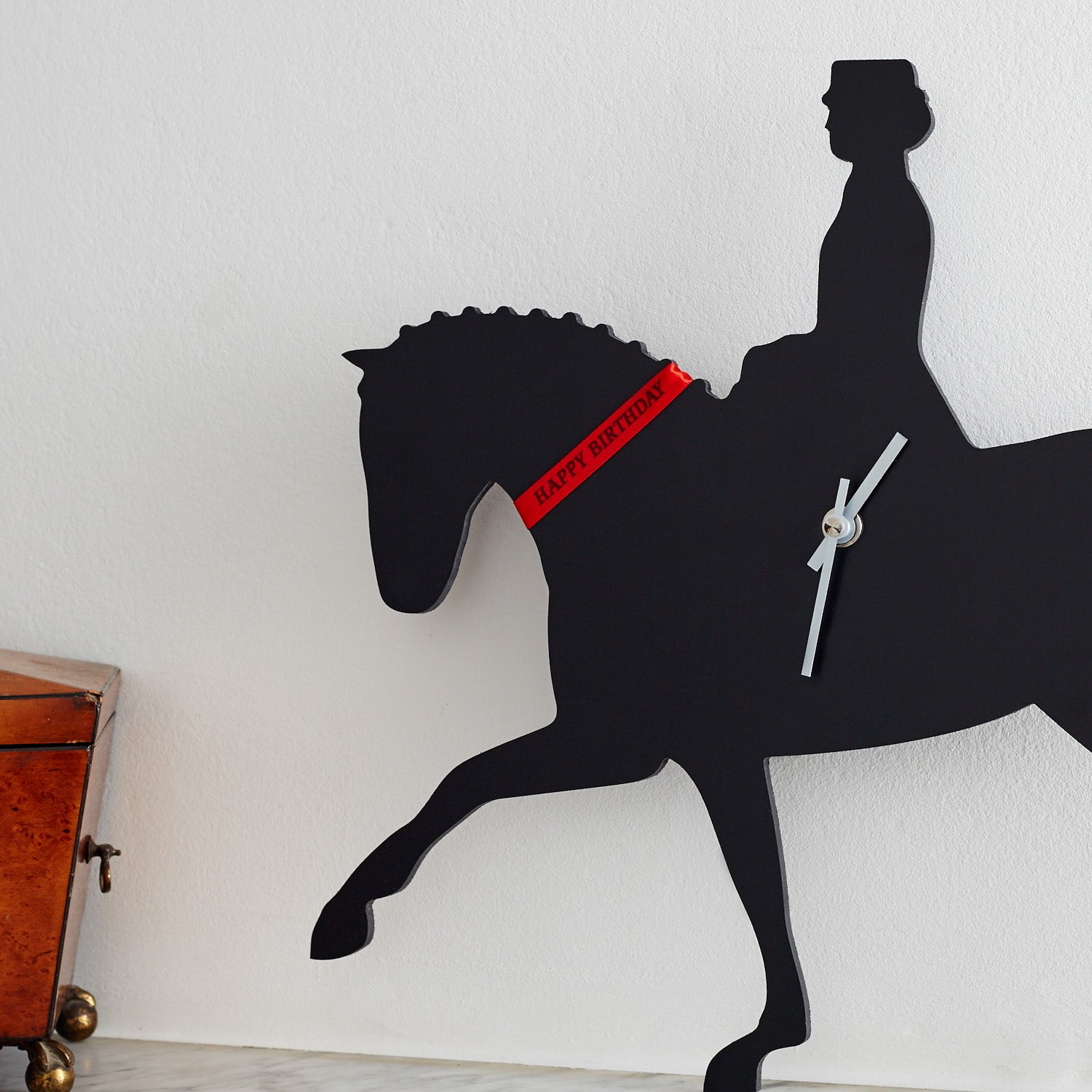 Horloge de dressage avec queue qui remue à la seconde. Fabriquée en Foamalux avec aiguilles en nickel, elle est fournie avec une pile. Dimensions : 38 cm x 34 cm. Elle peut être fixée au mur sur un clou ou appuyée contre un mur.