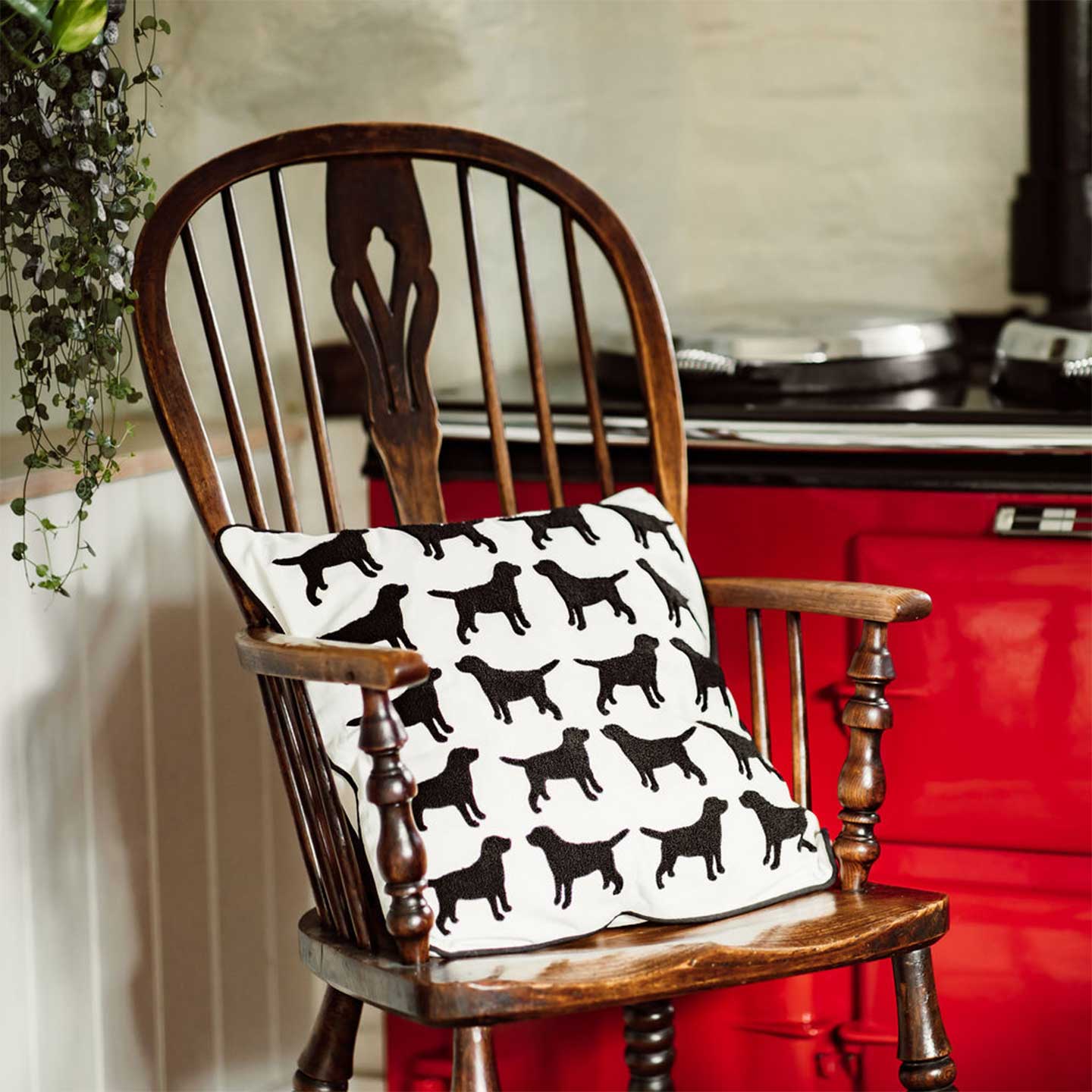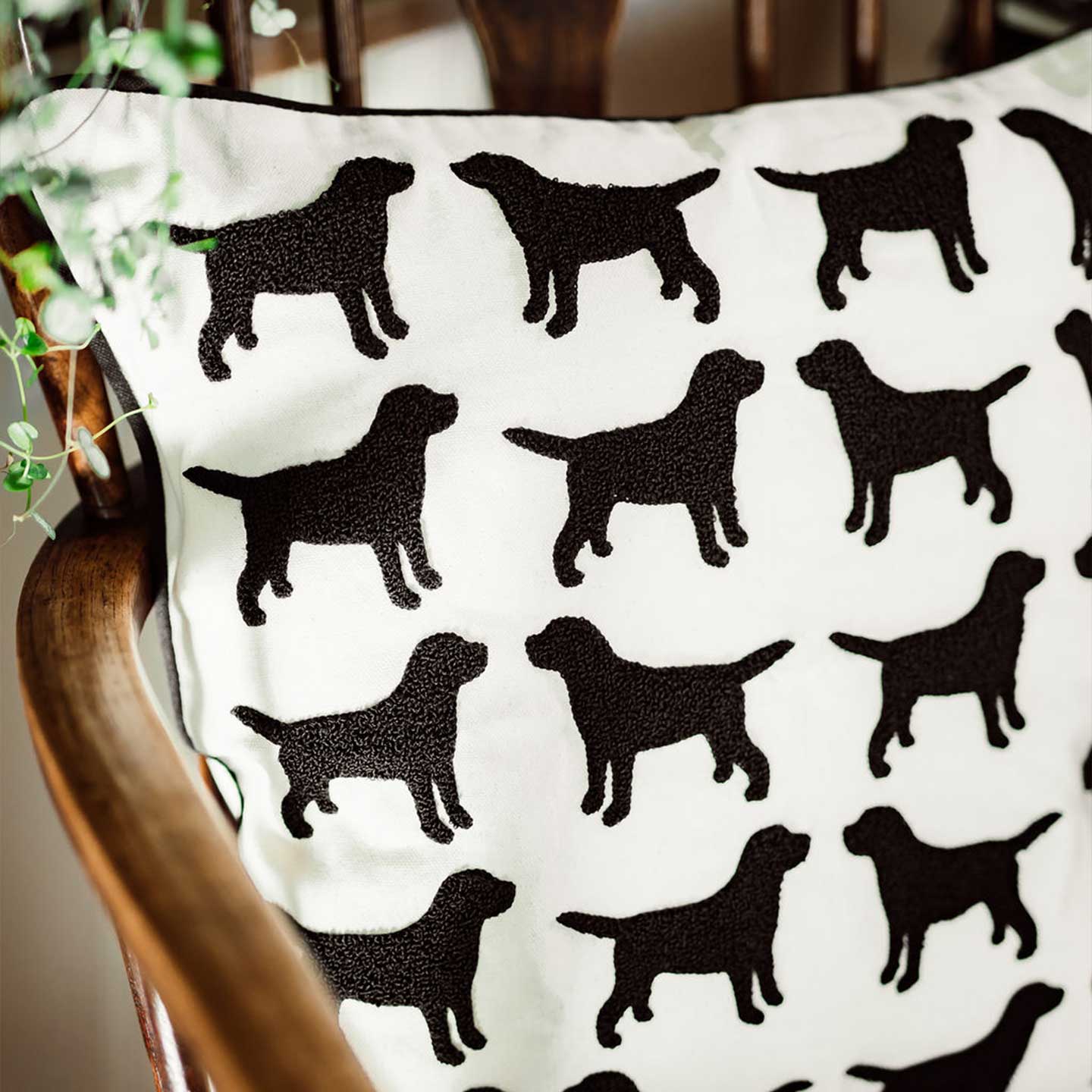 Add charm to your home with the Black & Cream Labrador Cushion Cover. Crafted from premium 100% cotton (180-190 GSM), this 45x45cm cover features a natural base with soft, textured Chenille embroidery of black Labrador silhouettes. Finely detailed with smart contrast piping and a plain non-embroidered backing, it includes a discreet centre zipper for easy care. A durable and cosy accent for any dog lover's sofa.